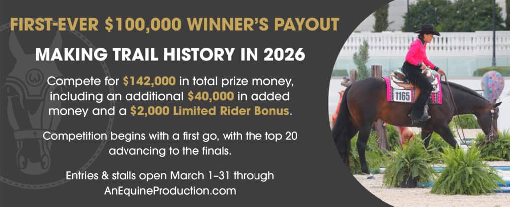 New for 2026, World Equestrian Center – Ocala will make trail history on April 17 when exhibitors compete for a total of $142,000 in prize money. Highlights include the first-ever $100,000 winner’s payout, an additional $40,000 in prize money, and a $2,000 Limited Rider bonus.