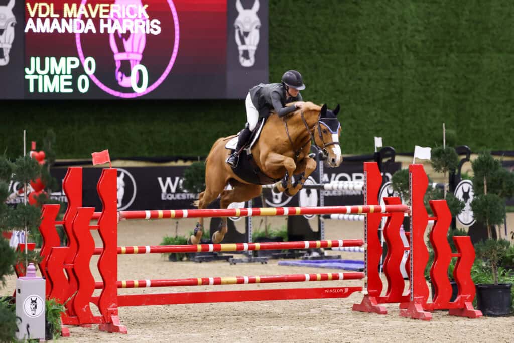 Harris and her 14-year-old Belgian Warmblood gelding, VDL Maverick (Tinkas Boy), jumped to the time to beat, but a heartbreaking rail earned the pair the red ribbon.