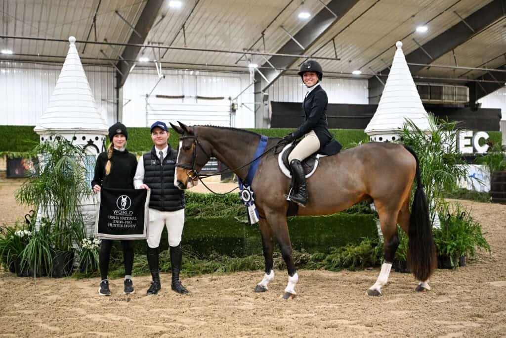 The $10,000 USHJA National Non-Pro Hunter Derby of WEC – Wilmington Thanksgiving in the Midwest kicked off Friday afternoon’s featured classes. Twenty-two horse-and-rider combinations jumped around Scott Alder’s tracks, but it was Kaycie Miranda and her own Bon Jovi (Balou Du Rouet x Hannah Montana) who showcased consistency to claim the win.