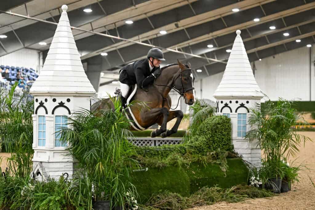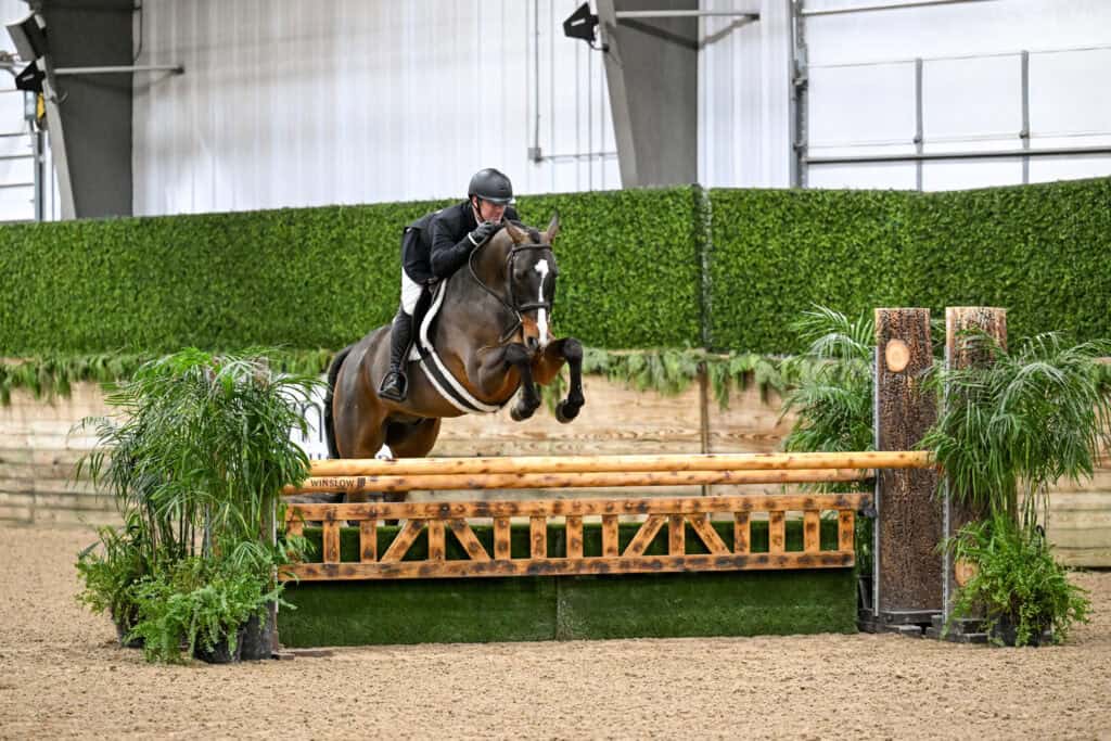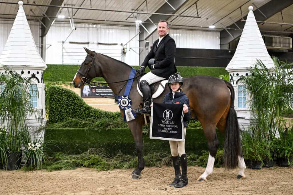 Wilmington, Ohio – Greg Crolick emerged victorious in the final $10,000 USHJA National Open Hunter Derby of the Midwest Indoors series at World Equestrian Center – Wilmington (WEC) Friday evening in the R+L Arena. Aboard Paula Monforton’s Tangelos (Tangelo Van De Zuuthoeve x Silbermaedel Dree Boeken), Crolick impressed the judges with the highest scores of the day to claim the win.