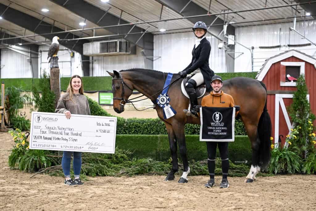 Wilmington, Ohio – The $15,000 USHJA National Open Hunter Derby was the highlight event Friday evening at World Equestrian Center – Wilmington (WEC) Winter Classic 9. Fifteen competitive horse-and-rider combinations met to vie for the win, but it was Sarah Robertson and Marlene Weber’s D’esparges (Diarado x B-elli Spirel) that came out on top.