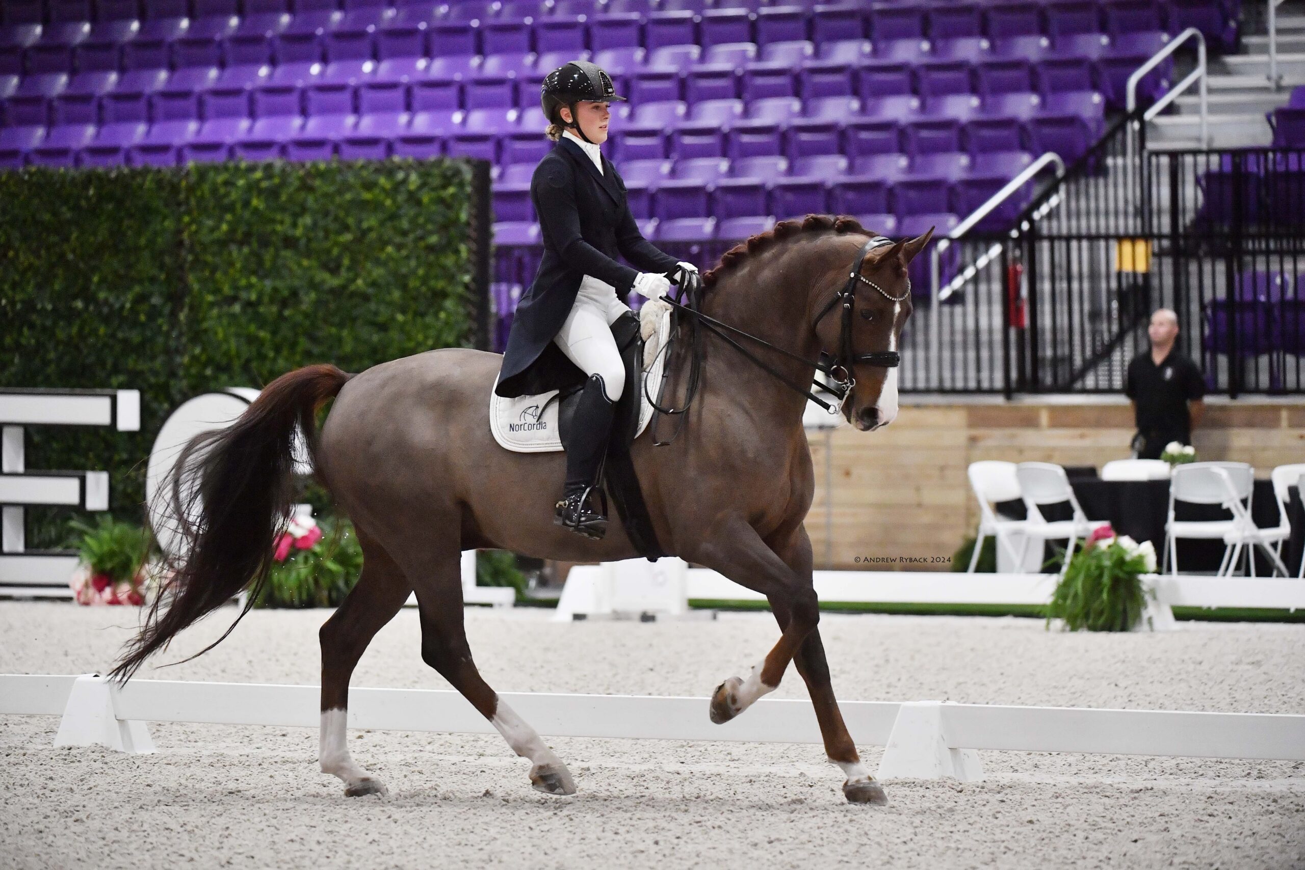 Catherine Haddad, winner of Friday’s Prix St. Georges, finished second to Marek in the Intermediate I riding NorCordia’s nine-year-old mare Sola Diva to 66.5%. Another NorCordia-owned horse, Level Up D, stepped up to win Saturday’s FEI Young Rider Team test. Sweden’s Emilia Berglund Bergåkra rode the eight-year-old KWPN gelding by Skovens Rafael out of a Contango dam to 67.206% on the horse’s international debut.