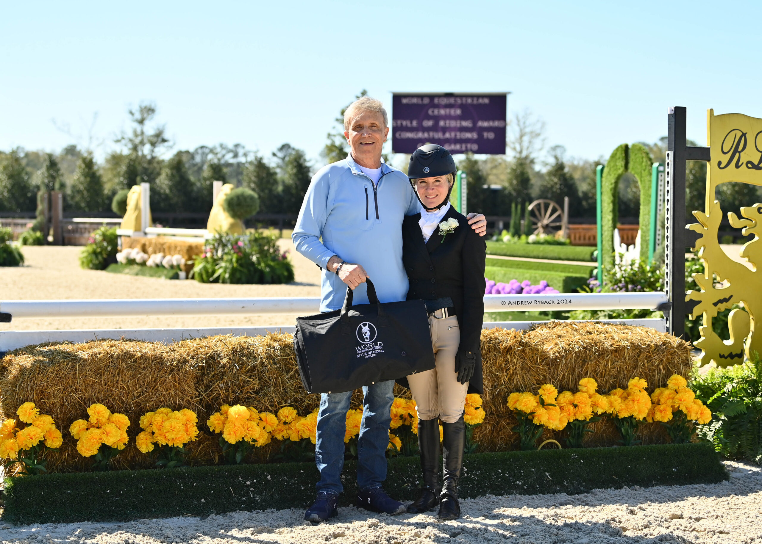 Before the start of the handy round in the $15,000 USHJA National 3′ Amateur Hunter Derby, Bill Rube presented the prestigious Style of Riding Award to Cara Garito for her classic style and her sportsmanship. The recipient serves as a role model for preserving the integrity and tradition of equestrian sport. “This award is very special to me because the recipient of this award pays it forward both in and out of the show ring,” says Rube. Garito received an elegant duffel bag and wore a white rose corsage on her lapel throughout the handy round to signify her achievement.