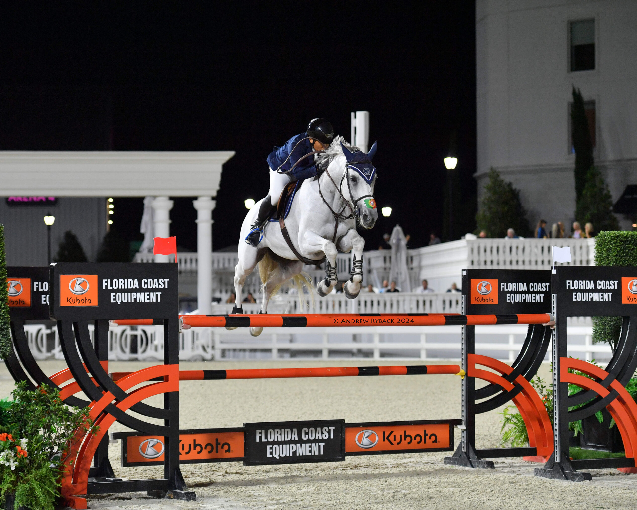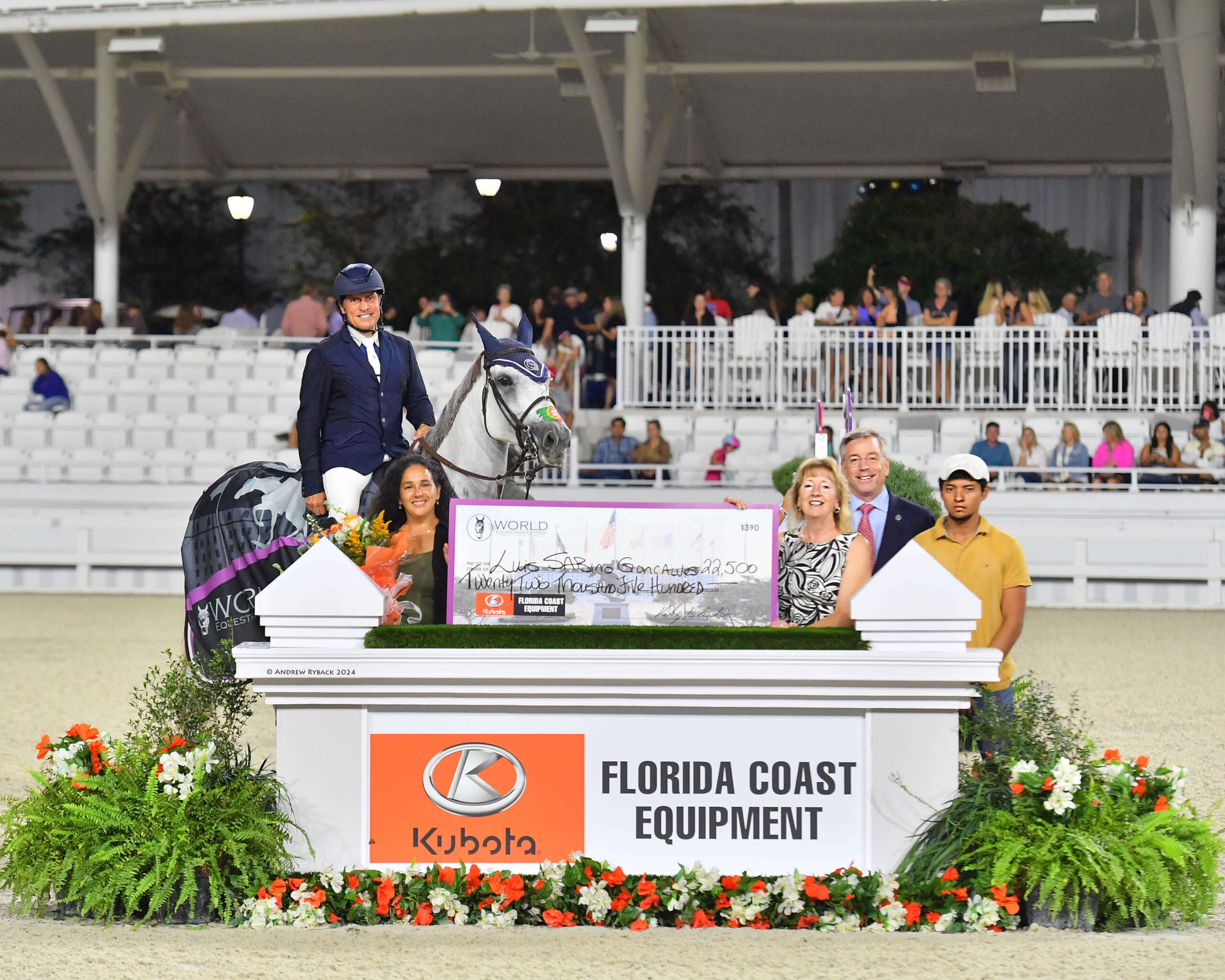 Ocala, FL – Saturday night Grand Prix action thrilled crowds once again at World Equestrian Center – Ocala during Week I of the 2024 November Show Series. Spectators flocked to the WEC Grand Arena to witness top-level competition in the $75,000 Florida Coast Equipment Grand Prix, where 26 accomplished horse-and-rider combinations navigated challenging courses designed by FEI Level III course designer Peter Grant (CAN). After an exciting 10-horse jump-off, it was Luis Sabino Goncalves (POR) and Sigma Stables LLC’s remarkable mare, Vick Du Croisy (Lord Carthago x Merveille Ducroisy), who claimed victory, repeating their win from the same week in 2023.