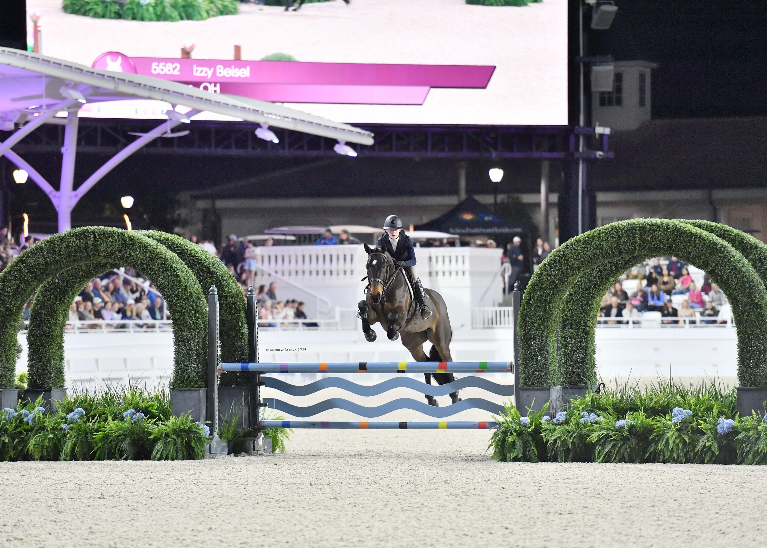 The championship commenced on Saturday afternoon with an over fences phase featuring a challenging track, testing the athletes’ equitation and precision. Despite many stellar performances, only the top 20 could advance onto the flat phase and second round of jumping, held under the lights of the WEC Grand Arena.