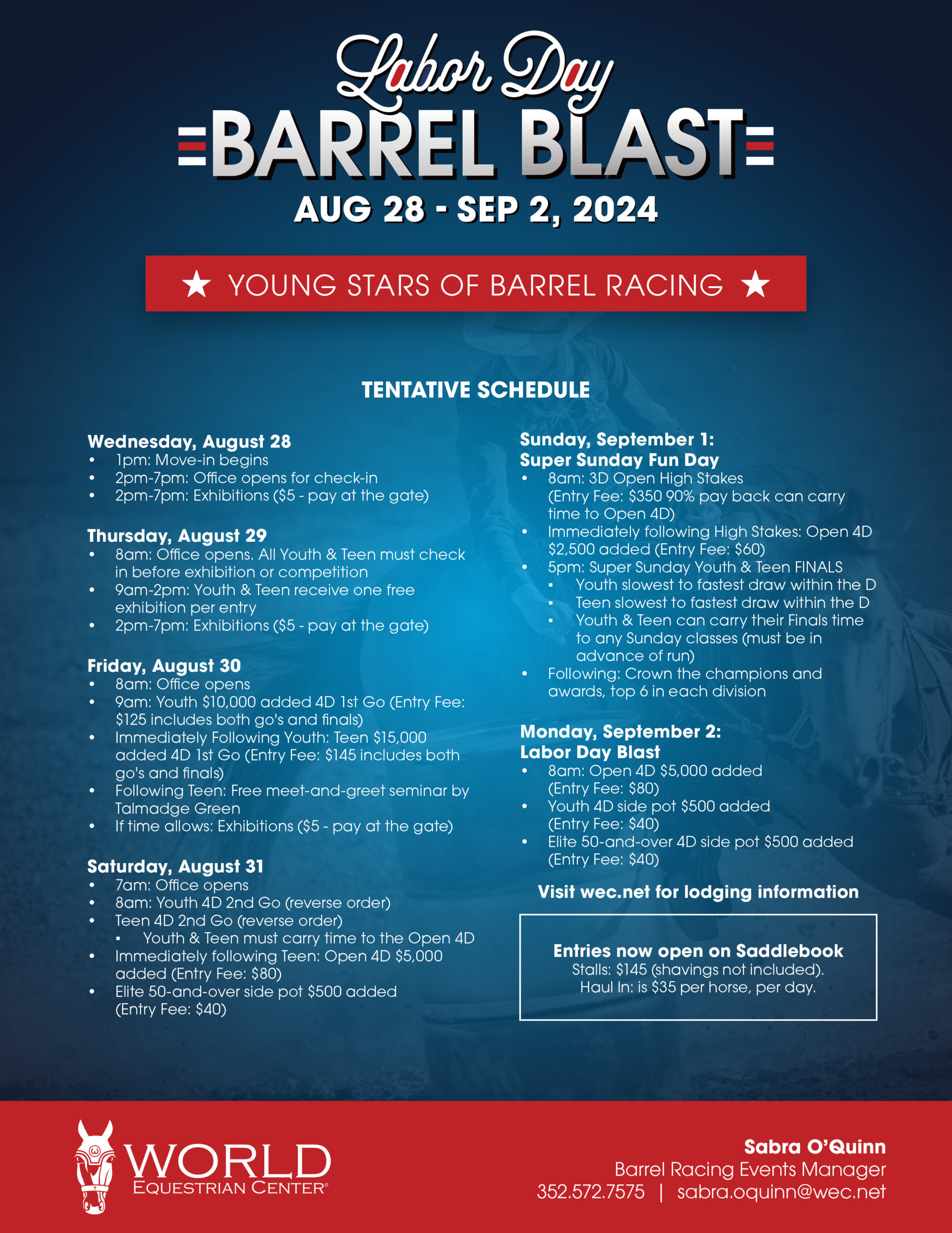 Ocala, FL – Entries and stall reservations open June 15 through Saddlebook.com for the Labor Day Barrel Blast, held from August 28 to September 2 in Indoor Arena 5 at World Equestrian Center – Ocala.
