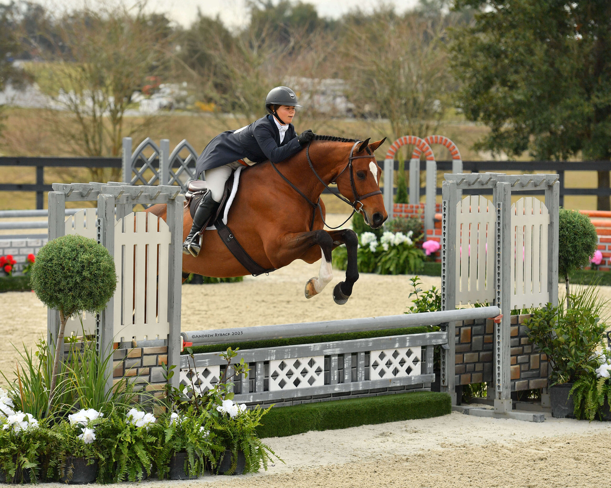 Ocala, FL – Eighty-four horse-and-rider combinations rode into Hunter 1 for the sixth Hunter Derby Friday of the 2025 Winter Spectacular Show Series, vying for top honors in three feature classes: the $20,000 Golden Ocala 3’6”-3’9” Hunter Derby, the $15,000 UF Veterinary Hospital USHJA National 3′ Open Hunter Derby and the $15,000 USHJA National 3’ Jr/Am Hunter Derby. Course designer Lynn Mullins set windy and exciting tracks that allowed room for riders to be creative as they planned their paths around the arena.