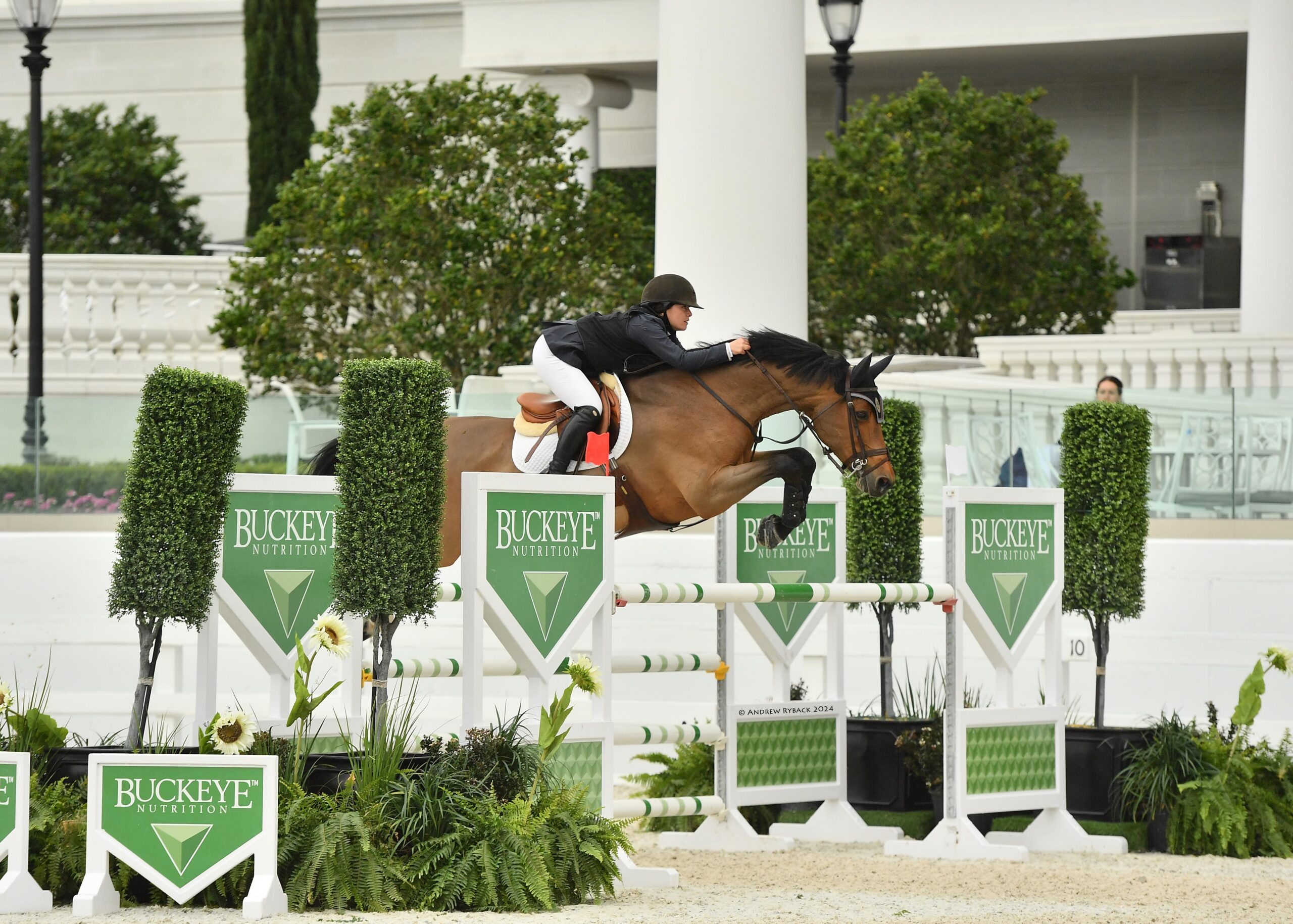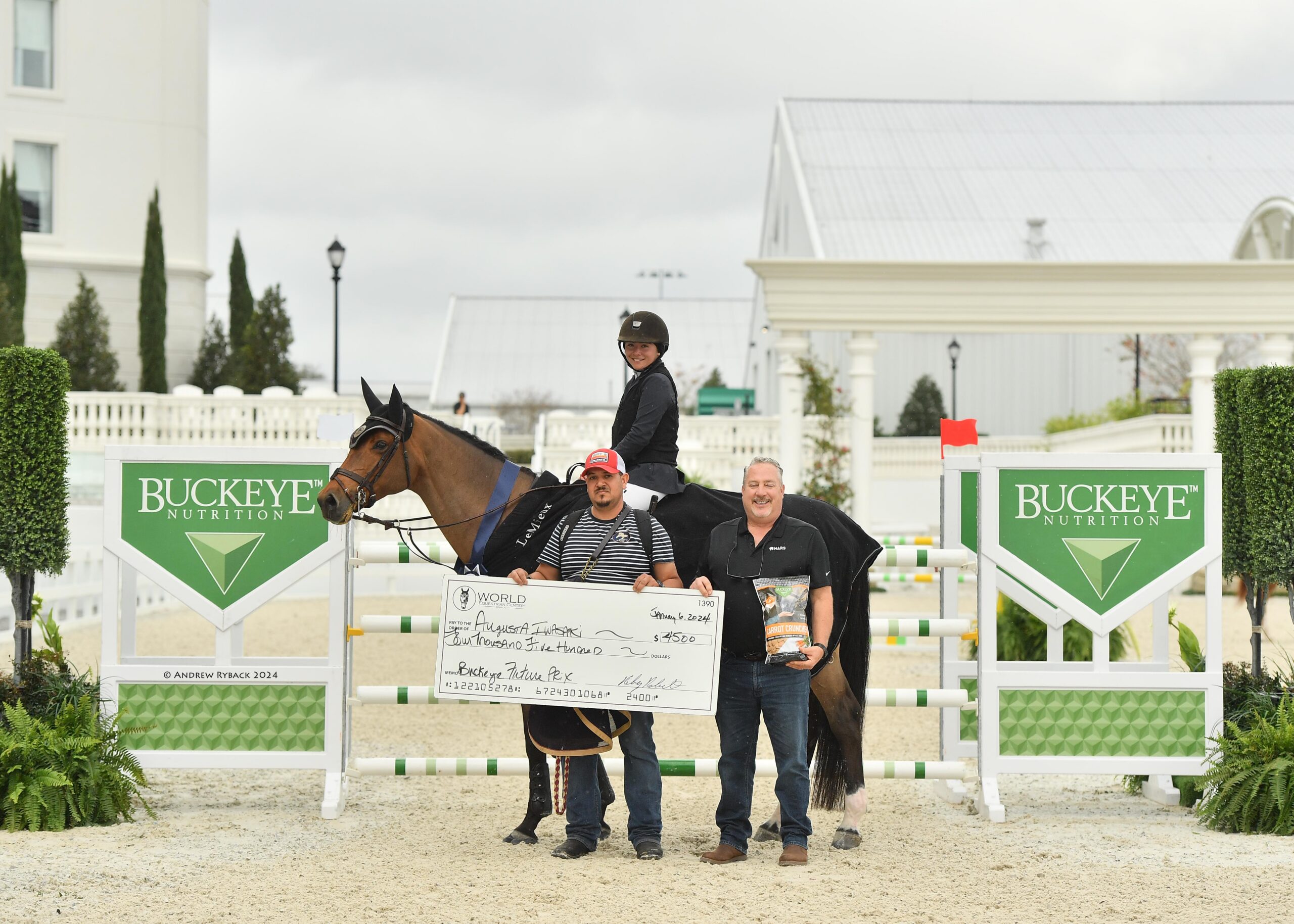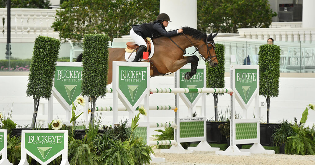 Ocala, FL – The $15,000 Buckeye Nutrition Futures Prix took center stage this afternoon, featuring a competitive field of 20 horse-and-rider combinations navigating a challenging track set by Steve Stephens (USA). Augusta Iwasaki (USA) and her accomplished partner, Fresca (Carambole x Zanesca), snagged the win and galloped away with the top prize.