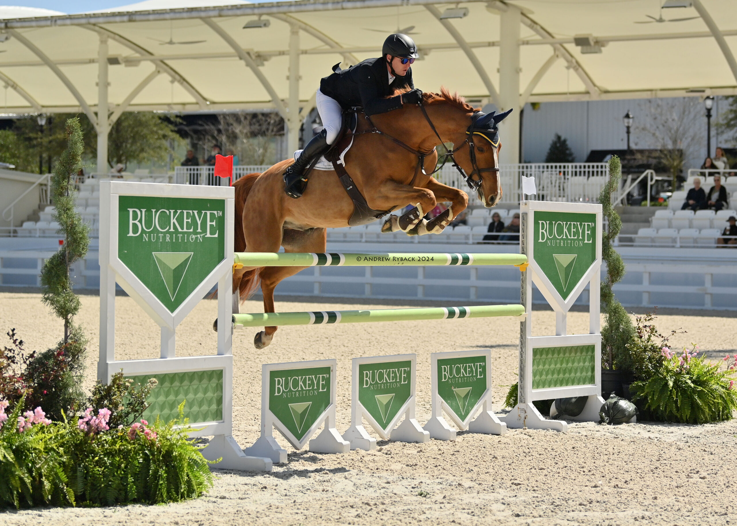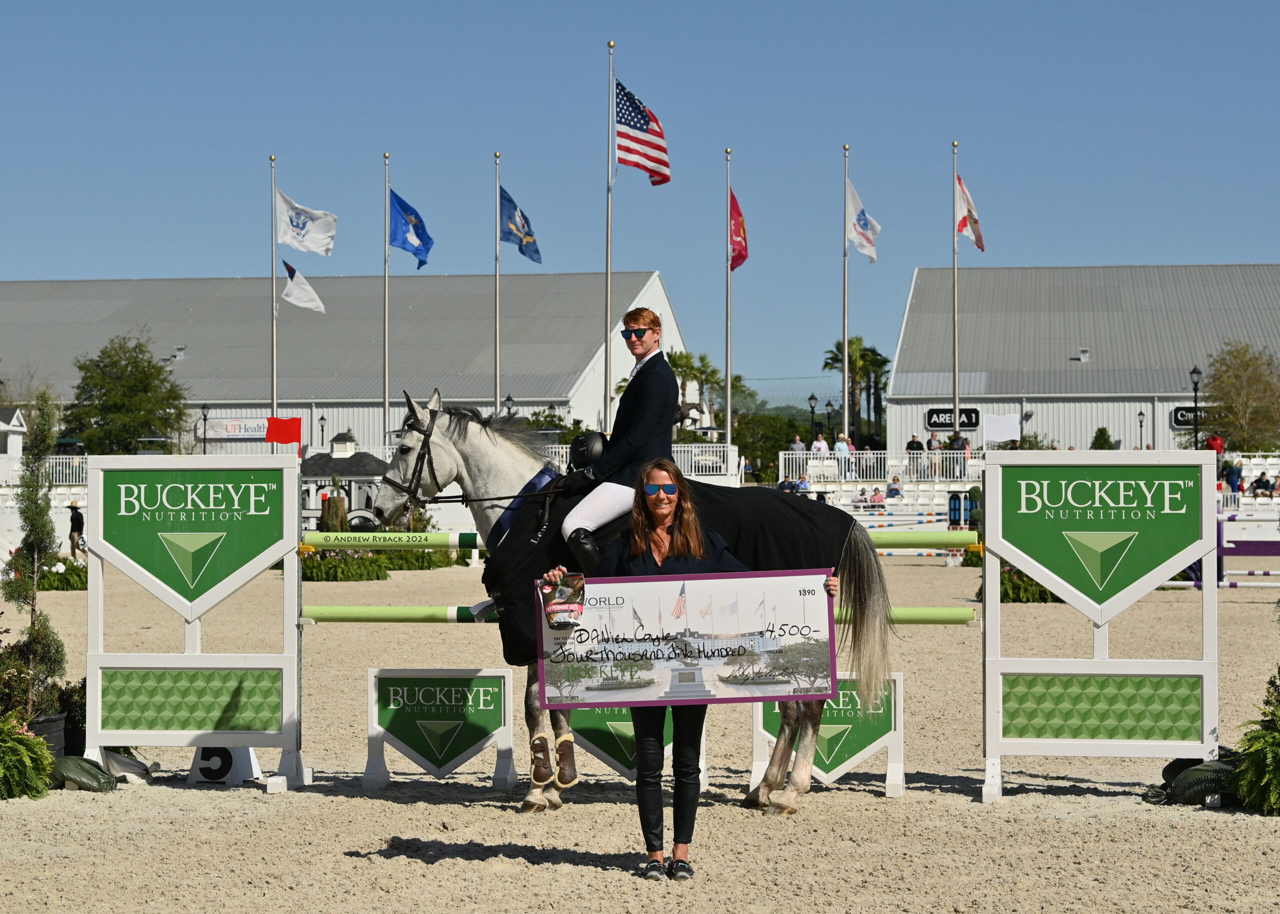 Ocala, FL – Thirty-two rising stars of show jumping showcased their skills at the WEC Grand Arena during the highlight event of the afternoon, the $15,000 Buckeye Nutrition Futures Prix. Peter Grant’s (CAN) tracks proved to be quite the challenge as only three horse-and-rider combinations managed to yield a double-clear effort. Ultimately, it was Daniel Coyle (IRL) who secured yet another feature class victory, this time riding Lovely Boy P (Arezzo VDL x G-Trio P), owned by Ariel Grange.