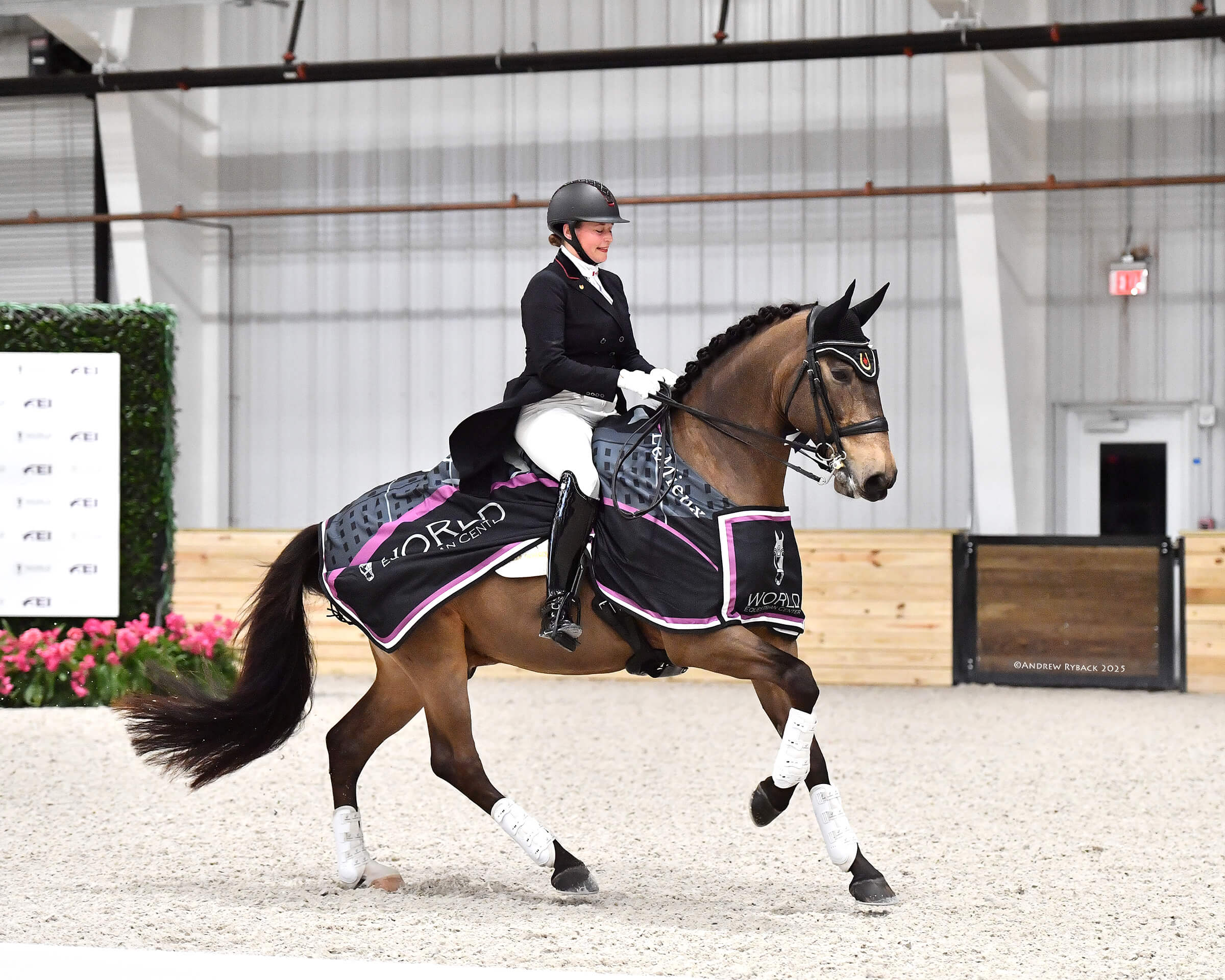 “I’ve been dreaming of trying to get up and over that 70% hump, and I felt that today I got there,” said Gallagher, who co-owns the horse with Ellen Lazarus. “I was trying to really be on my music, not chase it and take my time. He was listening to the music, and my piaffe and canter pirouettes felt great. My technical difficulty in the test is quite hard — everything is back-to-back combos, so I can’t miss them.”