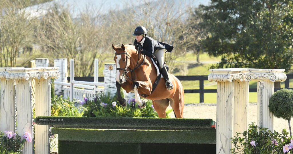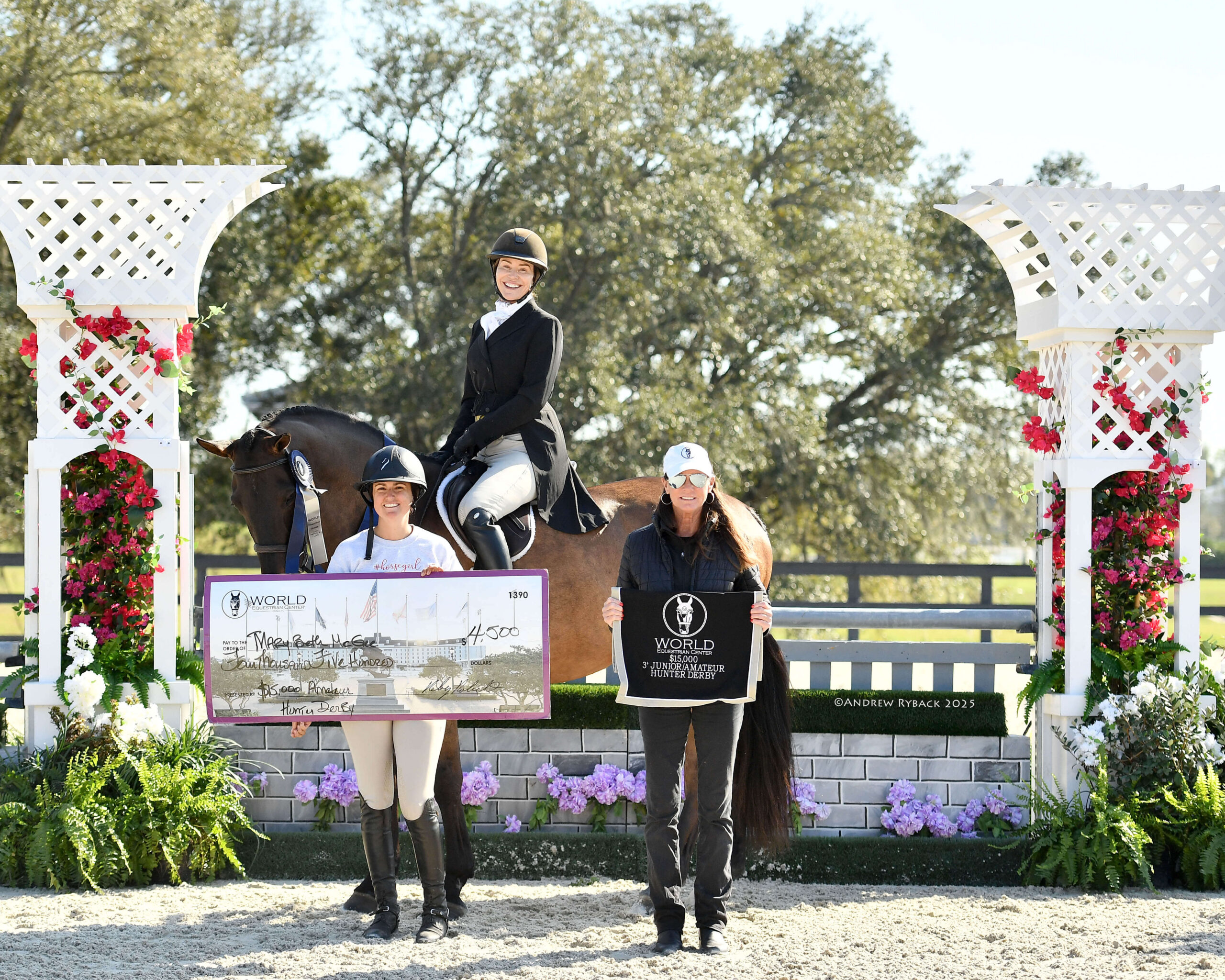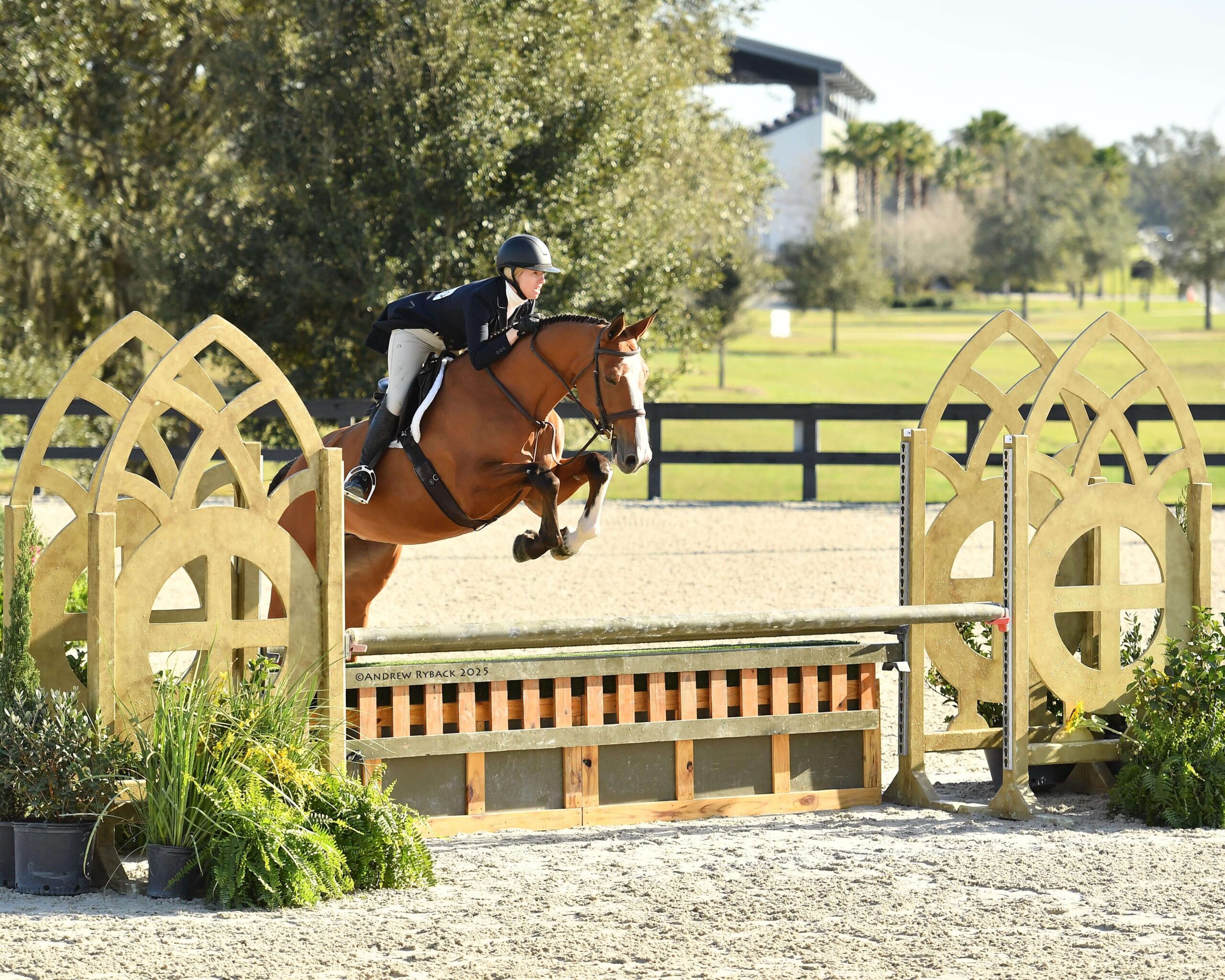 Ocala, FL – The eighth Hunter Derby Friday of the 2025 Winter Spectacular Show Series was a fun day of competition complete with ringside donuts and coffee. Hunter 1 hosted 68 competitors for four classes: the $20,000 Golden Ocala 3’6”-3’9” Hunter Derby, the $15,000 UF Veterinary Hospital USHJA National 3′ Open Hunter Derby, $7,500 USHJA National 3’ Junior Hunter Derby, and the $7,500 USHJA National 3’ Amateur Hunter Derby. Course designer Joe Carnicom built straightforward courses of unrelated distances encouraging horse-and-rider combinations to tackle each jump on an open stride.