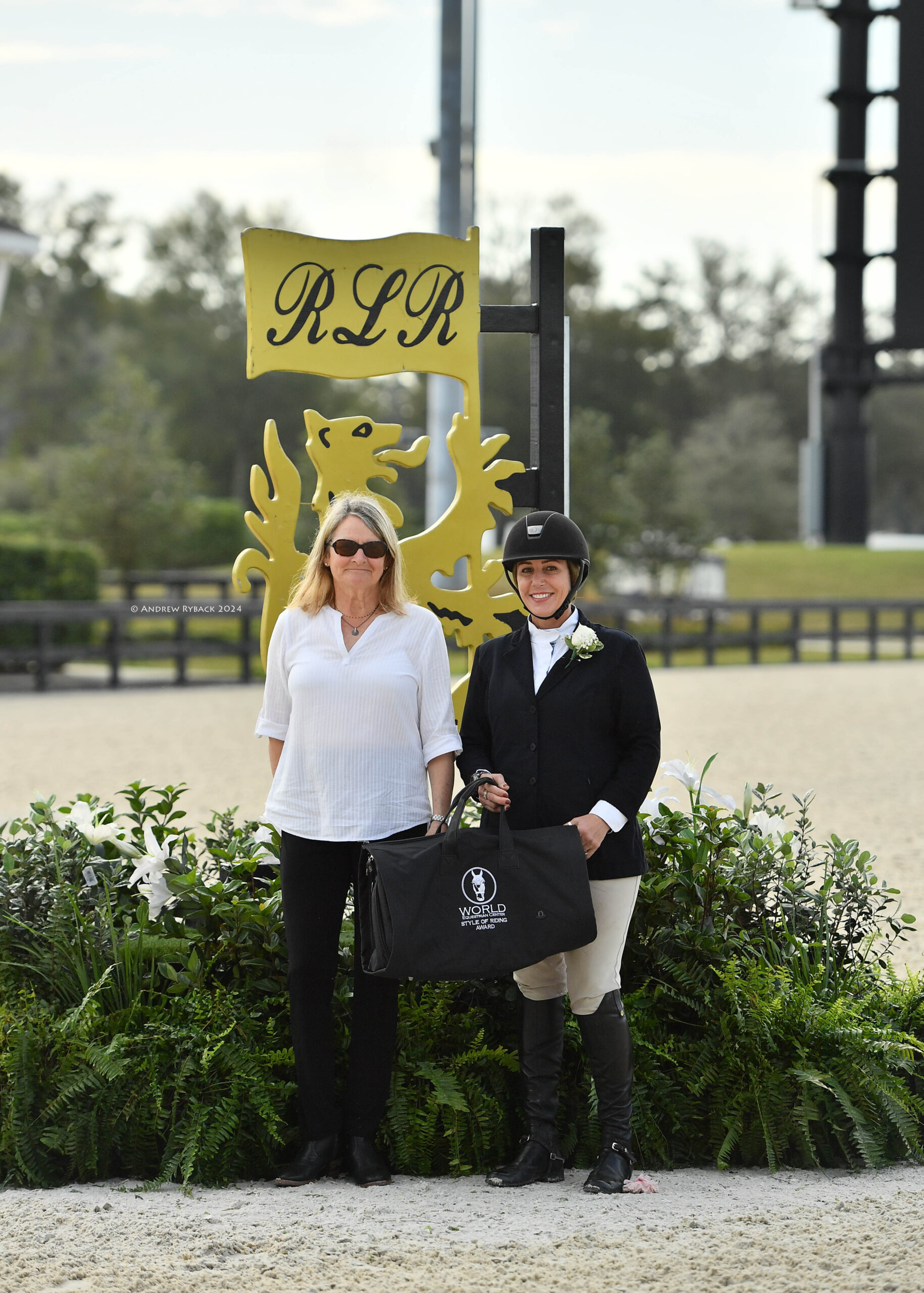 Before the start of the handy round in the $15,000 UF Veterinary Hospital USHJA National 3′ Open Hunter Derby, Bill Rube presented the prestigious Style of Riding Award to Clair Kellner for her classic style and her sportsmanship. The recipient serves as a role model for preserving the integrity and tradition of equestrian sport. “This award is very special to me because the recipient of this award pays it forward both in and out of the show ring,” says Rube. Kellner received an elegant duffel bag and wore a white rose corsage on her lapel throughout the handy round to signify her achievement.