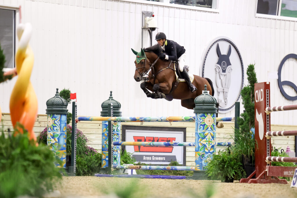 Aiden Clark rounded out the top three aboard his own 10-year-old Warmblood gelding, Celynos (Nevados S x Celyna), with the fastest time of 35.15 seconds but an unfortunate four faults.