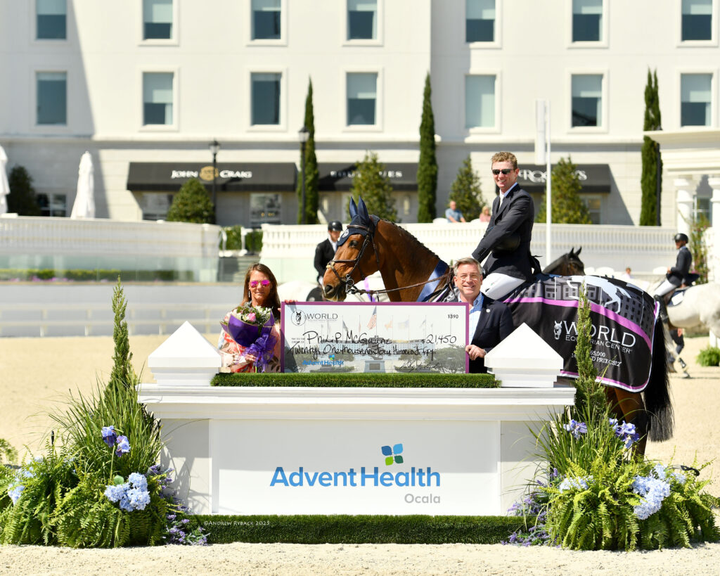 Ocala, FL – The $65,000 AdventHealth Grand Prix CSI2* was the thrilling finale of Week IX at the 2025 Winter Spectacular Show Series at World Equestrian Center – Ocala. Thirty-four combinations representing 10 nations battled for the lion’s share of the prize money, but it was Ireland’s Philip McGuane who piloted Evergate Stables LLC’s Linguini De La Pomme (Marius Claudius x Tinka’s Boy) to the win after an exciting 11-horse jump-off.