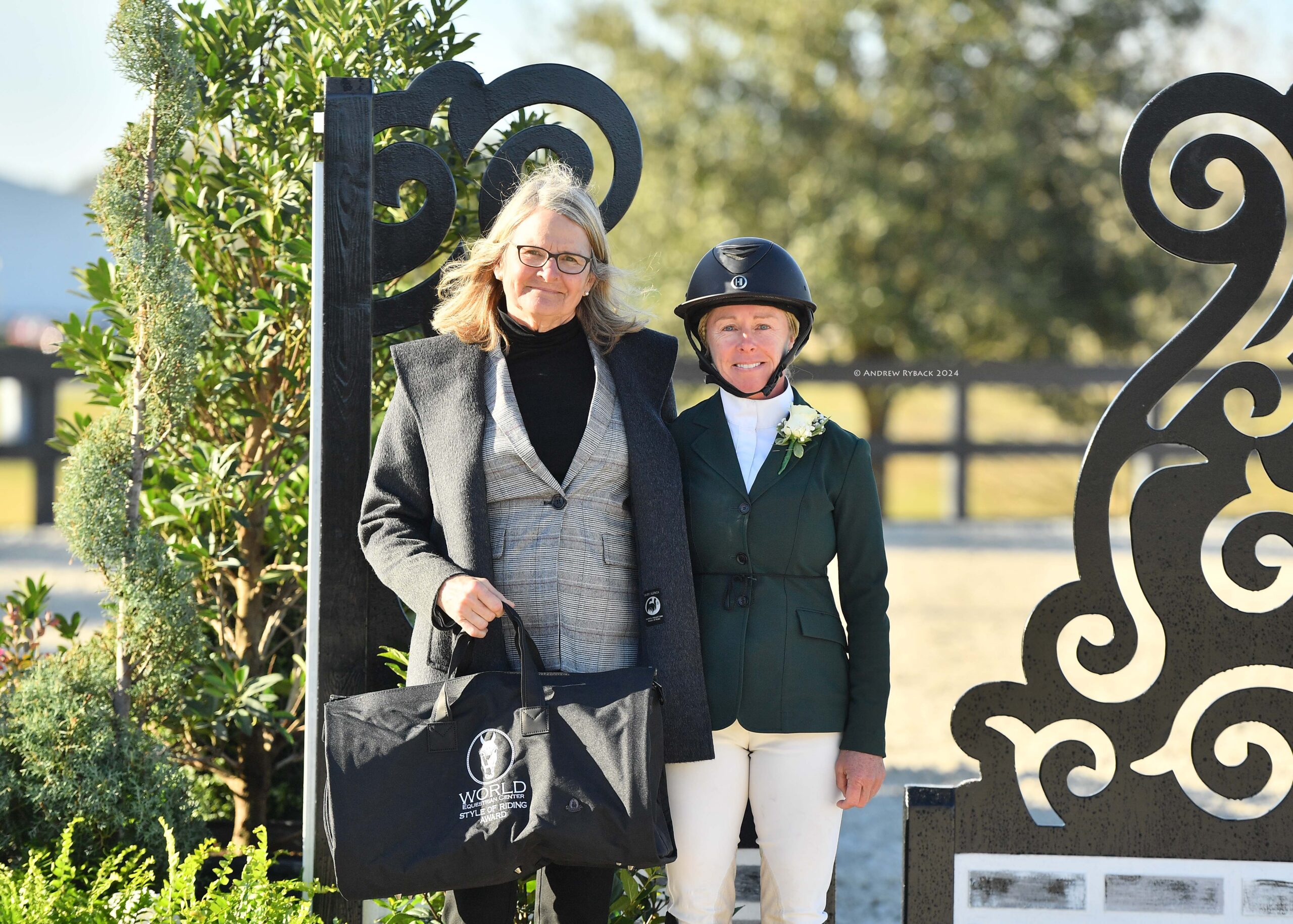 Before the start of the handy round in the $15,000 UF Veterinary Hospital USHJA National 3′ Open Hunter Derby, Bill Rube presented the prestigious Style of Riding Award to Helen Goddard for her classic style and her sportsmanship. The recipient serves as a role model for preserving the integrity and tradition of equestrian sport. “This award is very special to me because the recipient of this award pays it forward both in and out of the show ring,” says Rube. Goddard received an elegant duffel bag and wore a white rose corsage on her lapel throughout the handy round to signify her achievement.