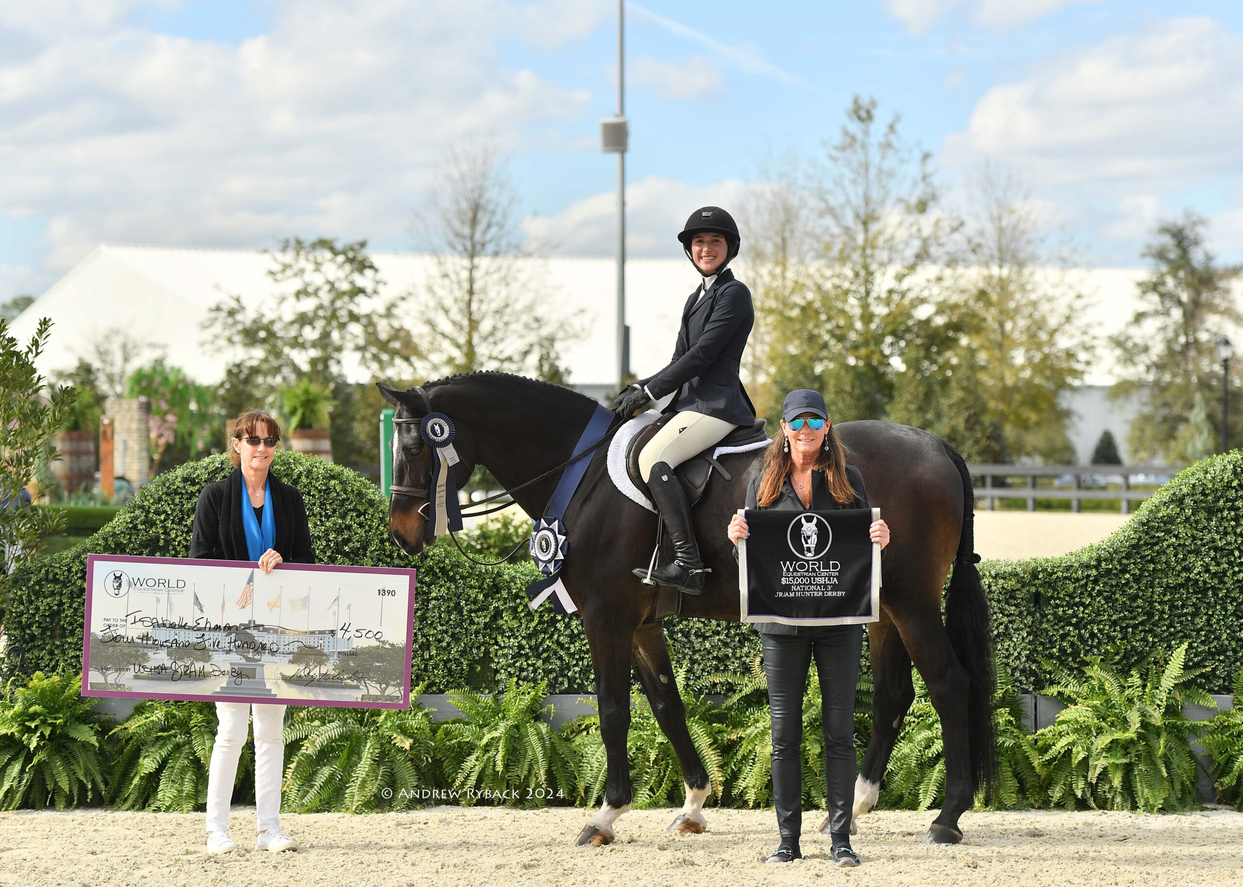 The $15,000 USHJA National 3’ Jr/Am Hunter Derby welcomed 36 talented junior and amateur athletes to compete over natural tracks built by Tom Hern. Isabelle Ehman and her longtime partner, Jargerbomb, owned by Double E, LLC left a lasting impression on the judges and secured the victory with two impressive scores in the 90s.