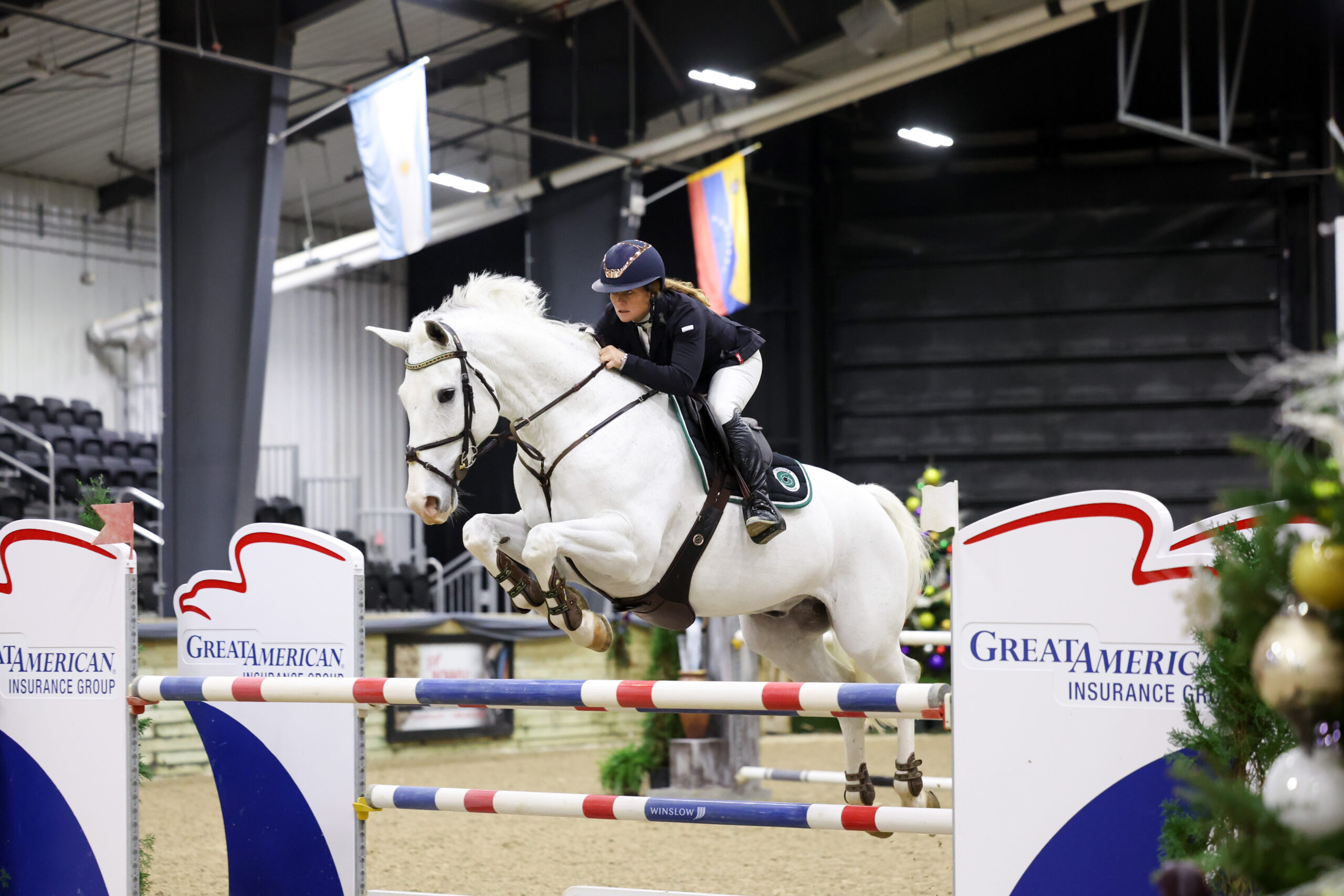 Wilmington, Ohio – The crowd in the Standlee Sanctuary went quiet Saturday evening as Sarah Meier (USA) entered for the jump-off in the $30,000 Grand Prix of Christmas in the Midwest. Bobby Murphy (USA) designed the final track for 15 athletes that allowed only five to return for the tie breaker.