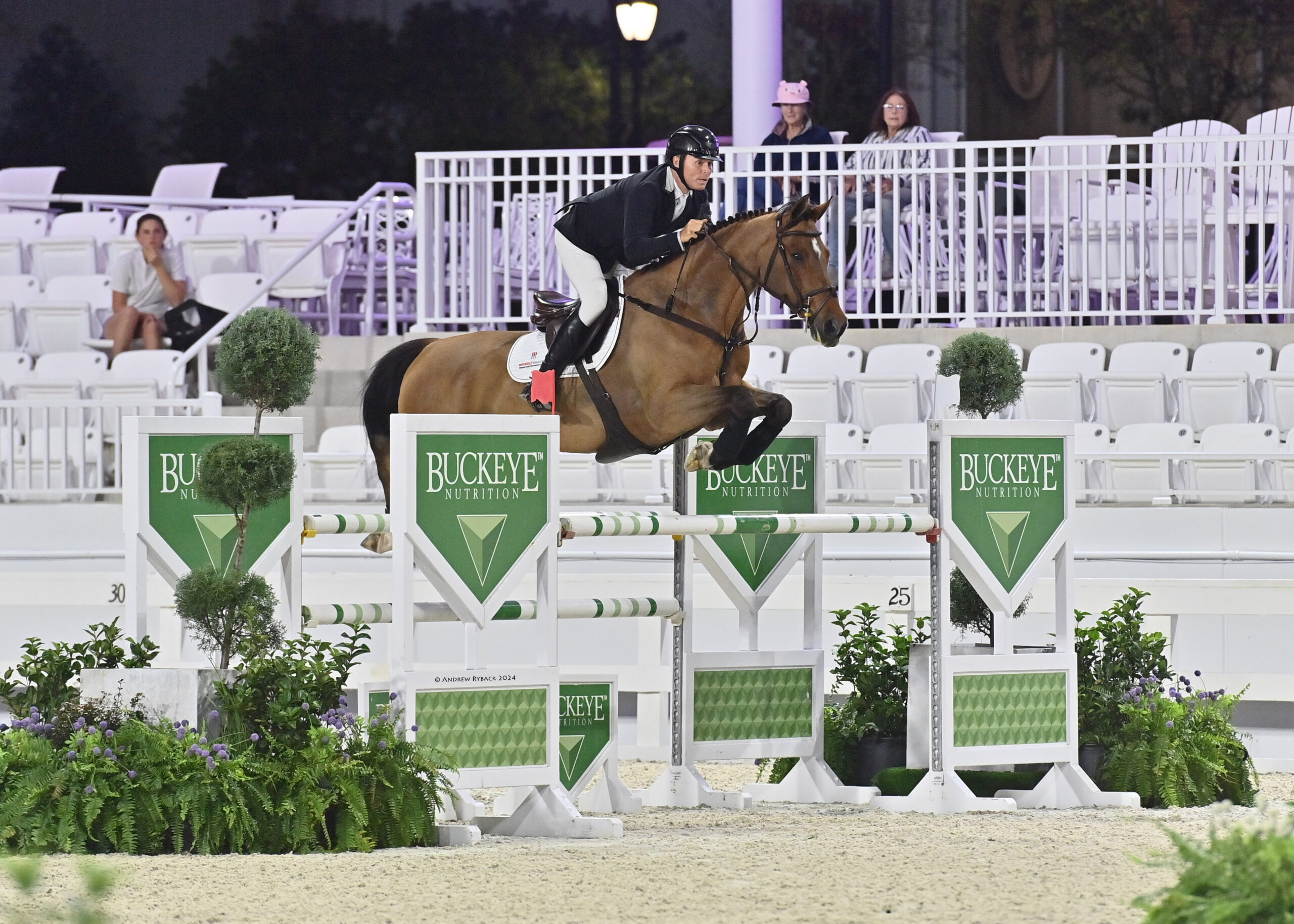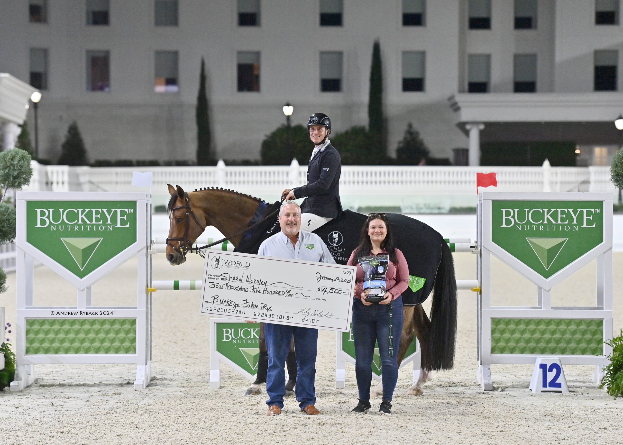 Ocala, FL – The $15,000 Buckeye Nutrition Futures Prix returned to the WEC Grand Arena under the lights to give the future superstars of show jumping a chance to compete in an atmosphere similar to the Saturday night grand prix. Ken Krome (USA) crafted a demanding course, and only four horse-and-rider duos advanced to the jump-off. Sharn Wordley (NZL) snagged the victory aboard North Face Farm’s Hagelin (Stolzenberg x Grafin Top), saving the best for last.