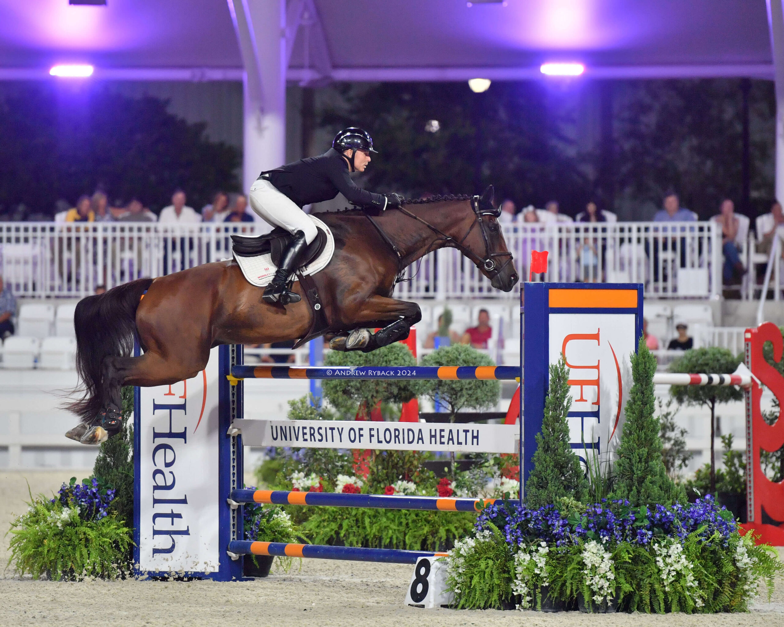 Ocala, FL – The 2024 Summer Series culminated in an electrifying showdown as 32 elite horse-and-rider combinations from nine nations competed for the final feature class win of the season in the $75,000 UF Health Grand Prix. The competition reached its pinnacle with a thrilling 12-horse jump-off, where the podium mirrored last week’s results, but this time, Sharn Wordley of New Zealand emerged victorious aboard Fernando Cardenas’ Valentine Car (Son Of Juan Car x Sofia Car).