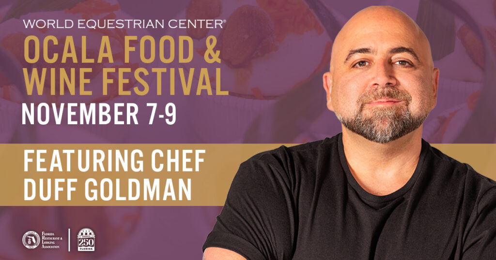 Ocala, FL – The fifth annual Ocala Food & Wine Festival returns to World Equestrian Center – Ocala (WEC) from November 7 to 9, 2025, with an exciting announcement: The Food Network star Duff Goldman will headline this year’s festivities with live appearances Friday, November 7 at the Chefs’ Dinner and Saturday, November 8 at the Grand Tasting. Festival attendees will now have the opportunity to experience his creativity and artistry at Ocala’s premier culinary event.