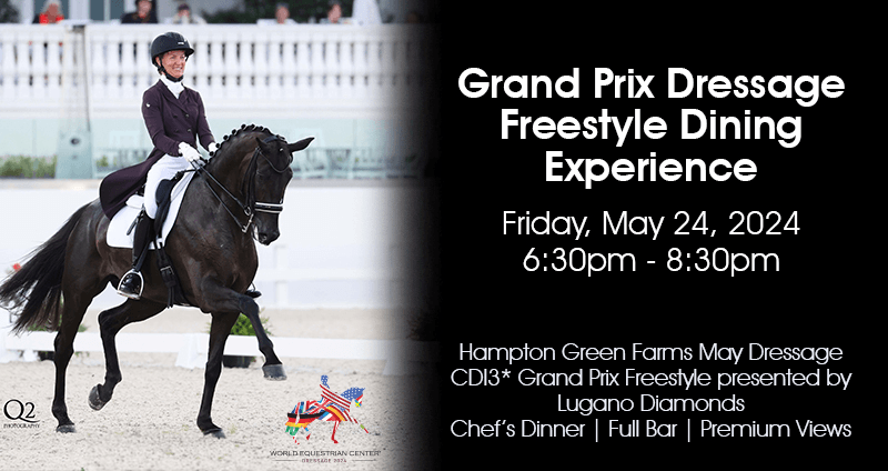 The Grand Prix Dressage Freestyle Dining Experience will be held on Friday, May 24, from 6:30-8:30 pm, offering premium views from the terrace of The Equestrian Hotel during the Hampton Green Farms May Dressage Grand Prix Freestyle CDI3* presented by Lugano Diamonds. The dining experience includes a dinner menu designed by WEC Executive Chef Bryan Thoman and access to a complimentary full bar of beer, wine and spirits as some of the world’s top dressage combinations dance in the WEC Grand Arena under the lights.