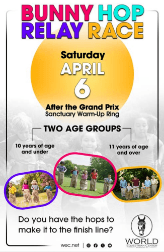 Join us Saturday evening in the Sanctuary warm-up arena for the Bunny Hop Relay Race! The race will be divided into two age groups of 10 years of age and under and 11 years of age and over. Do you have the hops to make it to the finish line? Prizes will be available.