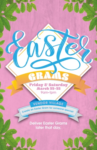 Join us in Vendor Village Friday, March 22, and Saturday, March 23, from 9am-1pm to create your Easter Gram! Create you Easter Gram for someone special and deliver it later that day!