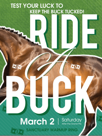 Join us Saturday evening immediately following conclusion of the grand prix in the Sanctuary warm-up arena for Ride-a-Buck! Test your luck to keep the buck tucked under your knee for a chance to win a prize!