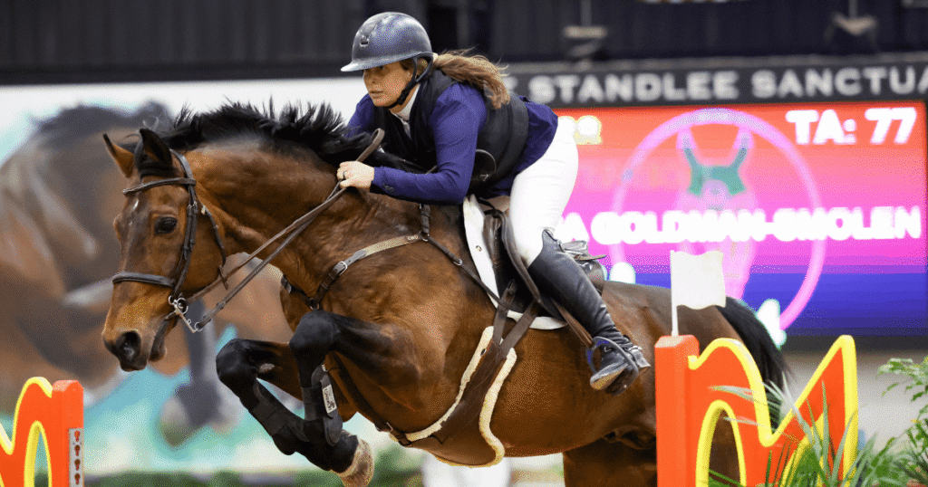 Wilmington, Ohio – Lisa Goldman-Smolen (USA) was back to her winning ways in the Standlee Sanctuary Saturday evening at WEC – Wilmington like she never left. This past October, Goldman-Smolen jumped in her final class at the Fall Classic Series before adding a baby girl to her family and returned to Winter Classic 16 for the first time since, working her way right back to the top of leaderboard in the $30,000 Clinton County CVB Grand Prix.