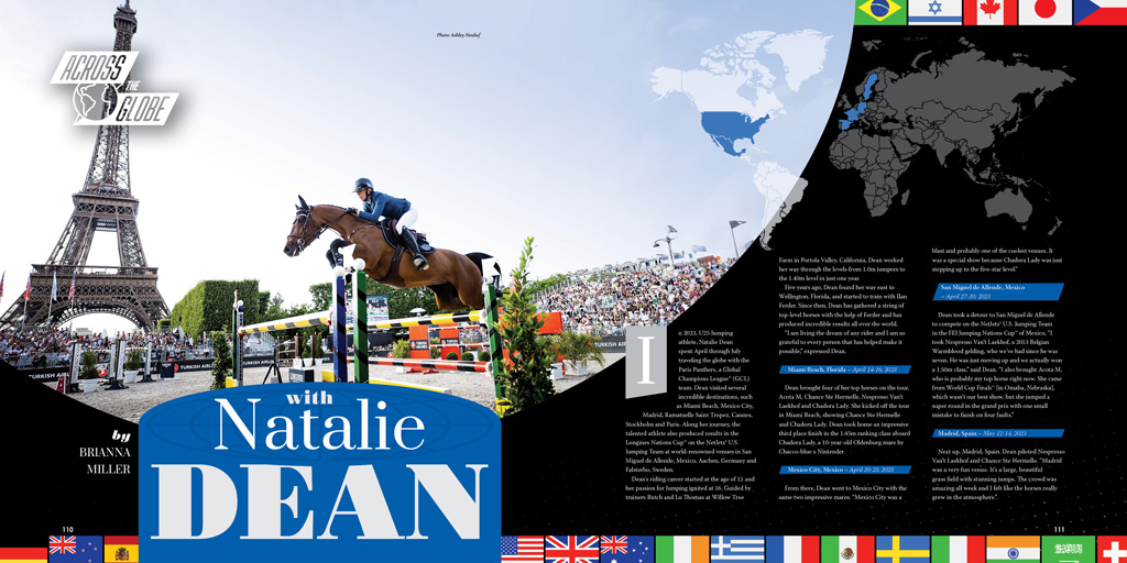 Our cover story highlights our new feature, ‘Across the Globe,’ where we follow the journey of American U25 athlete Natalie Dean. Dean explored numerous world-renowned destinations in 2023 with the Paris Panthers, a team in the Global Champion League™, and in the Longines Nations Cup™ as a part of the NetJets® U.S. Jumping Team.