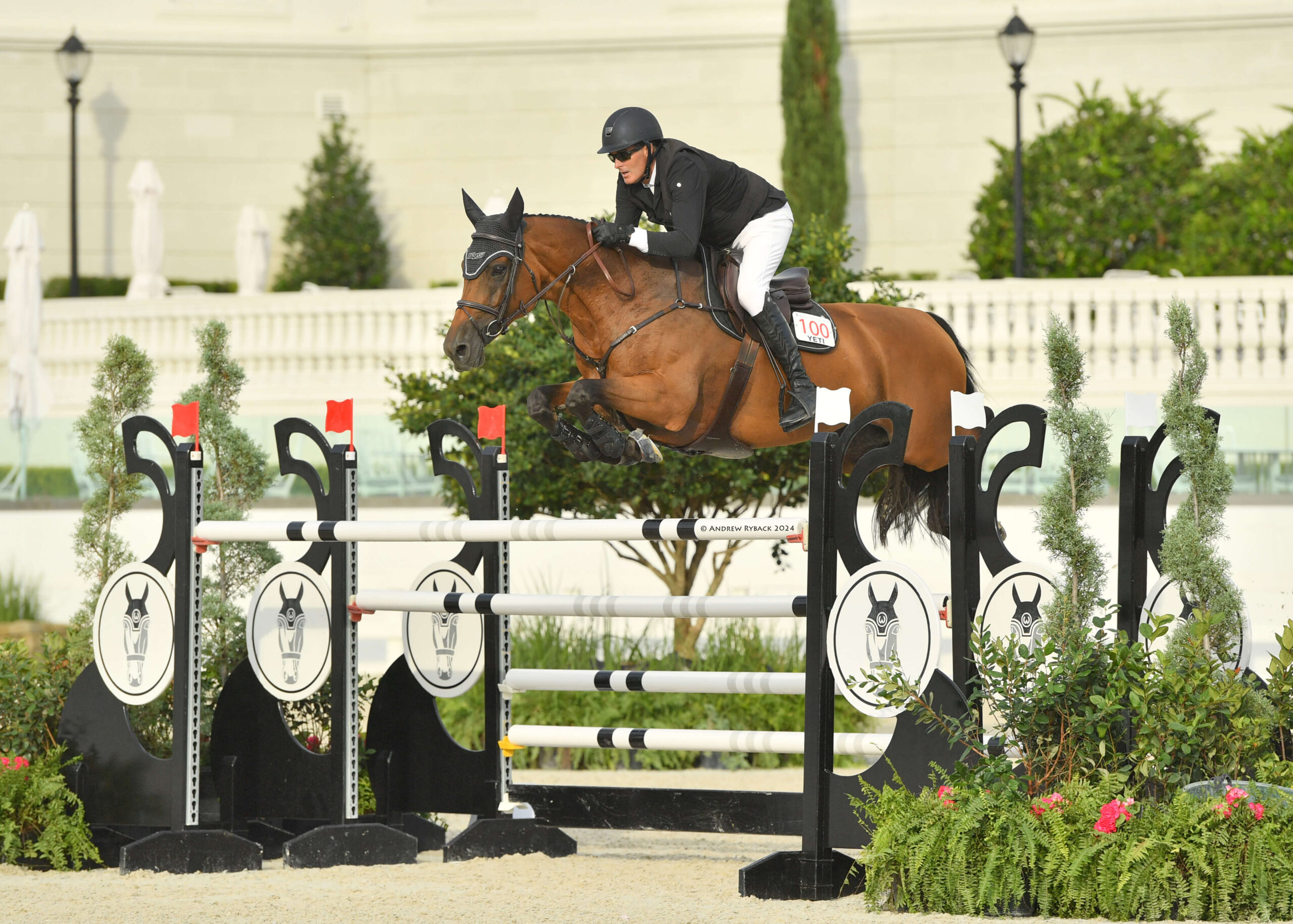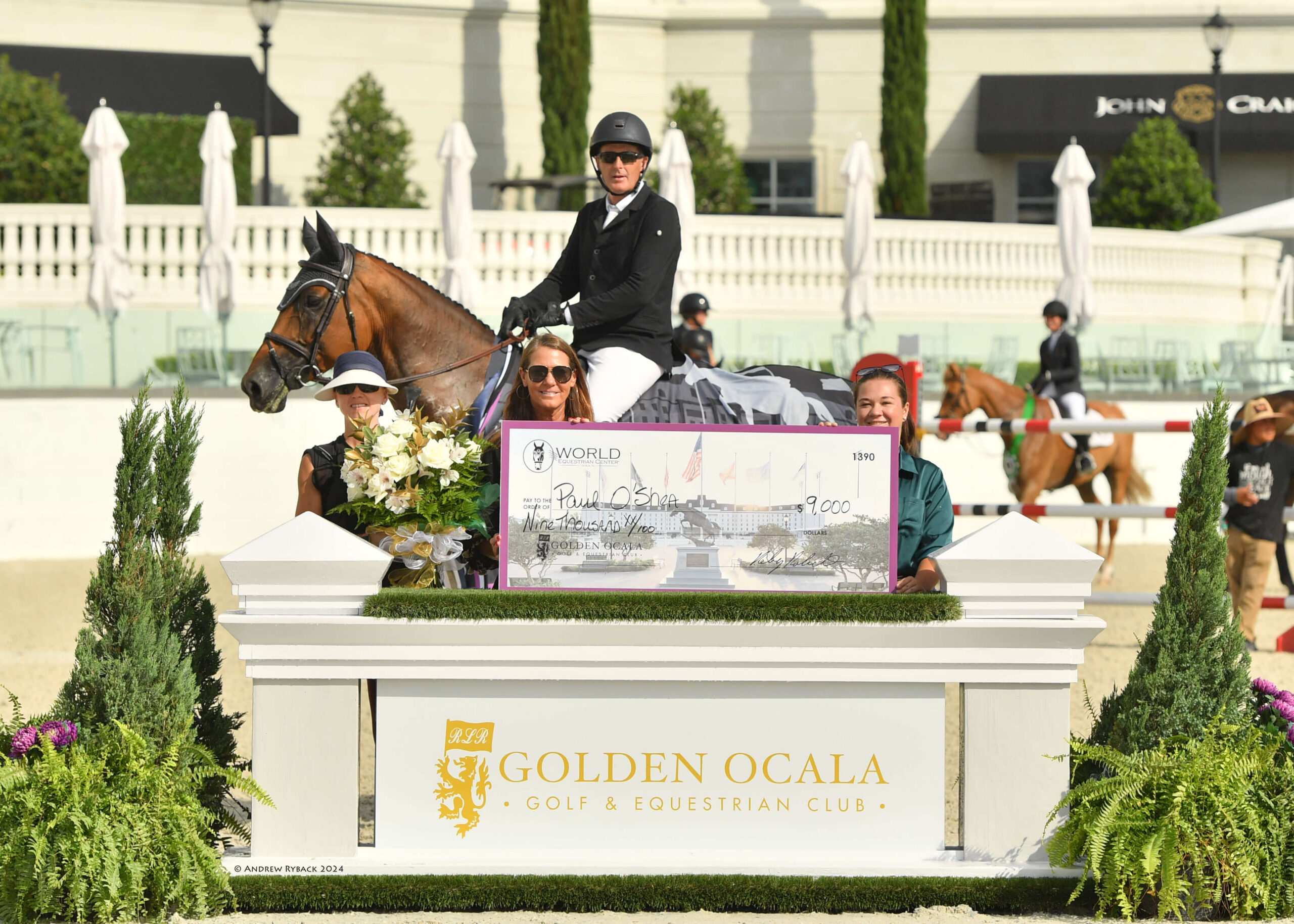 Ocala, FL – A beautiful sunny morning set the stage for the $30,000 Golden Ocala National Grand Prix, the final feature event of the first week of the World Equestrian Center – Ocala 2024 Summer Series. Twenty-five top horse-and-rider combinations competed, but it was Paul O’Shea (IRL) who stole the spotlight. Riding Team Eye Candy’s Hellcat (Cassander Van Het Bremhof x Dominica), O’Shea not only produced the sole double-clear effort but also clocked the fastest time, clinching victory.