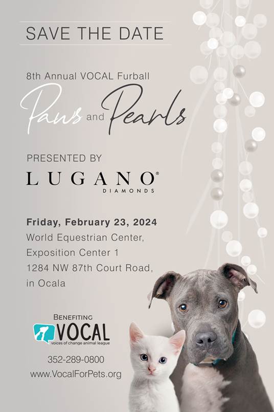 “Paws and Pearls” is the theme for the 2024 Furball and promises to be a perfect evening of blending VOCAL’s mission of solving the homeless pet problem with the glamour of a black-tie optional event.